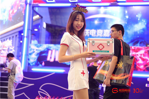 本届展会龙图游戏十周年粉丝活动,受欢迎的还是龙图医馆的医师们。小姐姐们身着“医师”服装,携带各类“增益buff”,全场“游走加血”,一经登场便引发全场围观。小姐姐们除了赠送各种游戏周边外,与热情粉丝亲密合影,贴心冰贴给CJ现场带来一丝清凉。小姐姐们头上的十周年主题发箍很是醒目,除了“萌萌哒”字样外,龙图游戏还备有“小鲜肉、小仙女”等定制款送给现场玩家。
